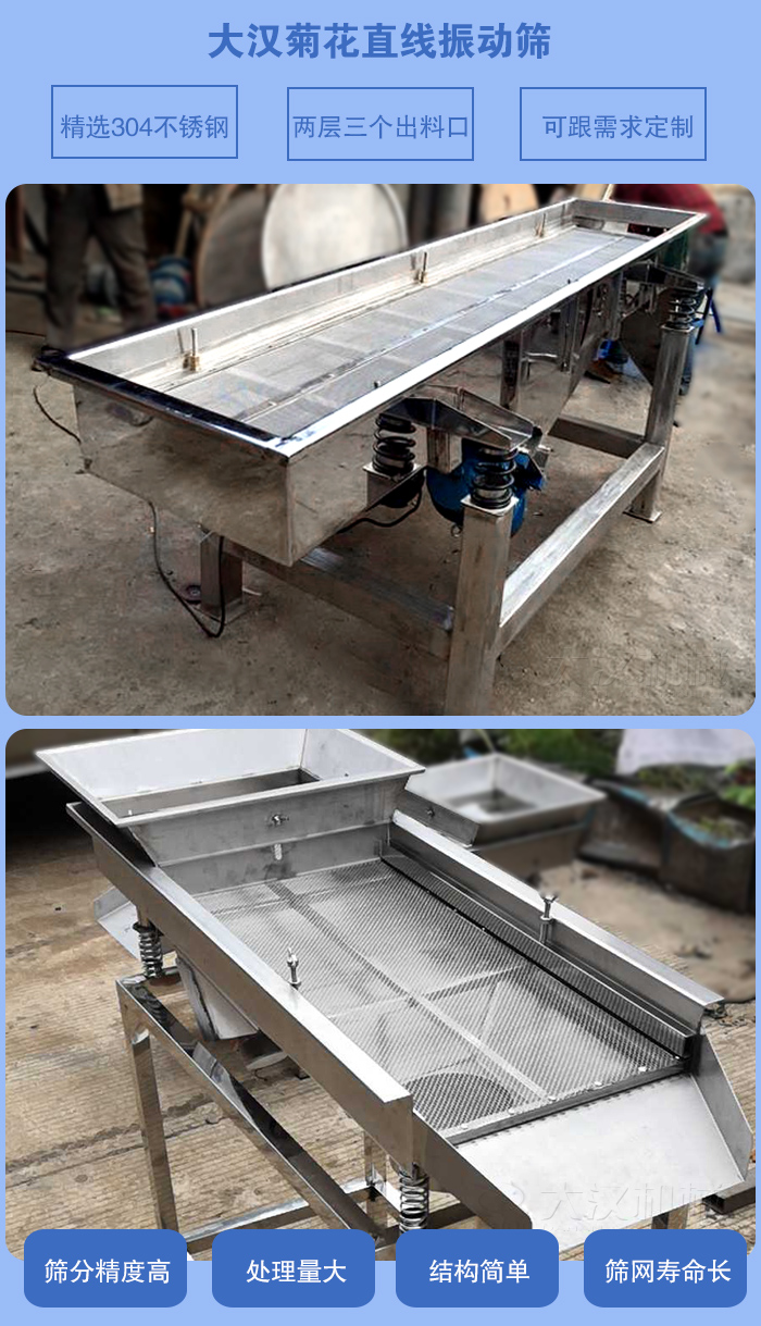 菊花為菊科植物的干燥頭狀花序。主產于浙江、安徽、河南等地。9-11月花盛開時分批采收,陰干或焙干,或熏、蒸后曬干。生用。藥材按產地和加工方法不同,分為“亳菊”、“滁菊”、“貢菊”、“杭菊”等。由于又有花的顏色不同,又有黃菊花和白菊花之分。 菊花在做成成品之前,需要進行除雜分級。這時候就需要用到直線振動篩,菊花直線振動篩篩分精度高,處理量大,結構簡單,篩網(wǎng)使用壽命長,下面有菊花直線振動篩廠家大漢機械為您具體介紹一下菊花直線振動篩: