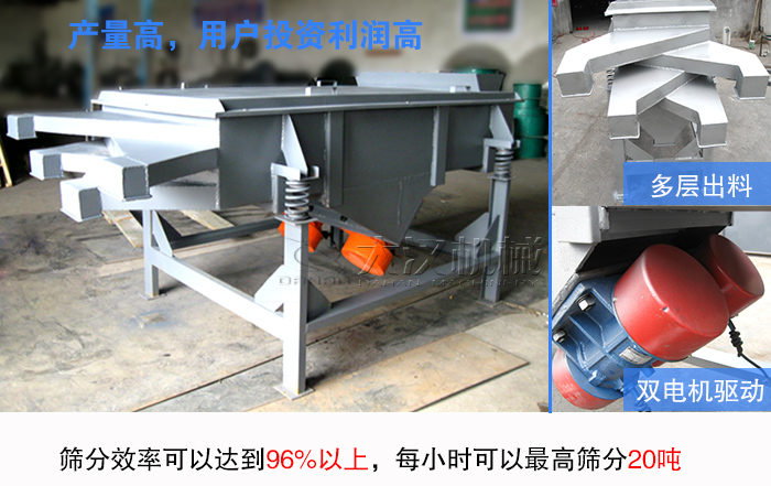 我們的直線式振動(dòng)篩采用雙胎電機(jī)驅(qū)動(dòng),篩分效率更高,多層篩網(wǎng)同時(shí)篩分,大單臺(tái)機(jī)器可分選出6到7個(gè)不同粒度的物料,滿足不同客戶的需要,篩分效率可以達(dá)到96%以上,每小時(shí)可以高篩分20噸。而且,大漢廠家還根據(jù)客戶的情況設(shè)計(jì)針對(duì)性的解決方案,為客戶創(chuàng)造更大收益,降低運(yùn)營(yíng)成本,但是直線式振動(dòng)篩價(jià)格需要根據(jù)用戶實(shí)際情況決定。