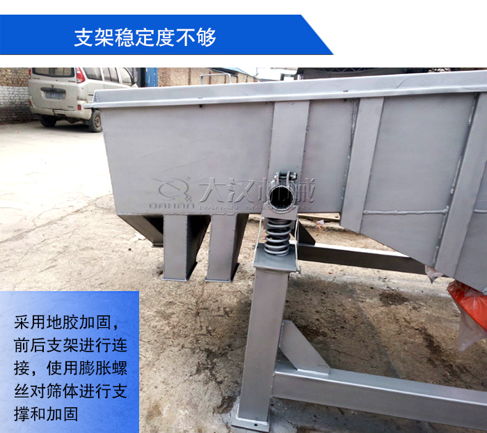 當直線振動篩支架過于簡單,就會導致篩體承受不了足夠的重量,篩機在工作時,其支架穩定性不夠,就會出現左右搖擺的現象。可以采用地膠加固,前后支架進行連接,使用膨脹螺絲對篩體進行支撐和加固,必要時可采用水泥澆灌,使直線振動篩的作用力作用在地面上。