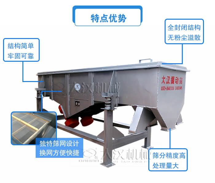 2、直線篩采用全封閉結(jié)構(gòu),無粉塵溢散,自動排料,更適合于24小時流水線作業(yè);