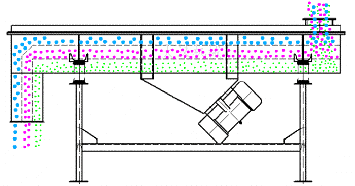 碳鋼直線振動篩結(jié)構(gòu)主要由篩箱、篩框、篩網(wǎng)、振動電機、電機臺座、減振彈簧、支架等組成。采為雙振動電機驅(qū)動,當(dāng)物料從給料機均勻地進(jìn)入篩分機的進(jìn)料口時,兩臺電機通過同步、反向旋轉(zhuǎn)時所產(chǎn)生的激振力在平行于電機軸線的方向相互抵消,在垂直于電機軸的方向疊為一合力,在激振力和物料自重力的共同作用下,使物料在篩面上被拋起向前作直線運動,物料通過多層篩網(wǎng)產(chǎn)生數(shù)種規(guī)格的篩上物、篩下物,然后又分別從各自的出口排出,從而達(dá)到篩分的目的。
