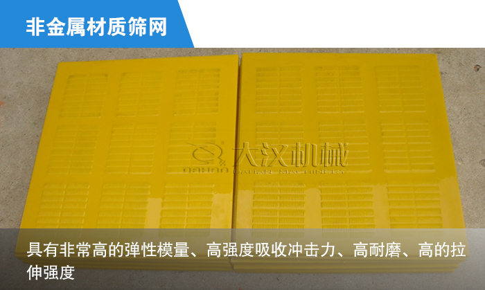 ④非金屬材質的振動篩篩網中,聚氨酯為常見,因為聚氨酯本身具有非常高的彈性模量、高強度吸收沖擊力、高耐磨、高的拉伸強度,因此其承載力較高,是橡膠篩板的 2.5 倍以上,使用壽命與普通金屬篩板相比提高8-10倍,是不銹鋼篩面的3倍,是天然橡膠的3.9倍,是當前耐磨性能較好的振動篩篩網材料。