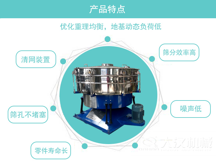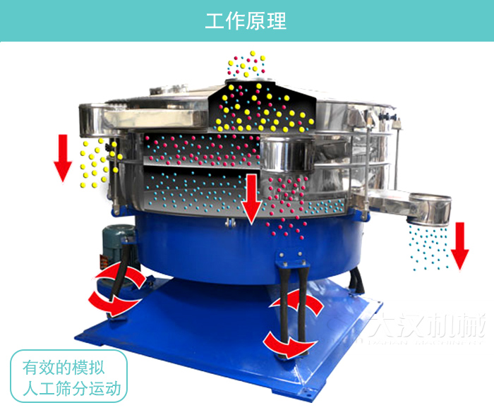 旋振篩,其原理是:瞬時運動為沿徑向的位移和以此位移為軸的圓周運動的合成(螺旋運動)。即可調節偏心距的激振器產生了非線性三維運動,物料也產生同樣的近似手動作業的運動,從而達到篩分之目的,再配合篩分附件可得到更加理想的篩分效果;適合于圓球狀、圓柱狀、片狀、乃至不規則形狀易堵網且需要精密篩分的物料。